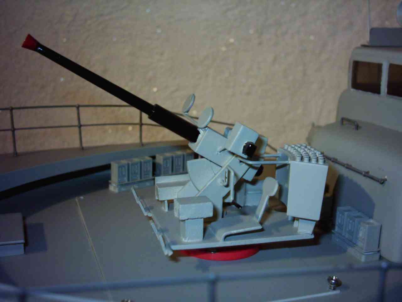 Rechts auf dem Bild die 40 mm Bofors - Maschinenkanone auf einem drehbaren Kranz. Diese Funktion habe ich mit einem Standardservo und Riemenscheibensatz gewährleistet. Dabei werden beide Kanonen über eine Riemenscheibe (gegenläufig) angetrieben. Diese Kanone gibt natürlich auch Spielraum für andere Funktionen, wie zum Beispiel Sprühen von Wasser oder Schießen mit Munition. Leider bin ich noch nicht zum Einbau dieser Funktionen gekommen. Aber was nicht ist kann ja, bekanntlicher weiße, ja noch werden. |