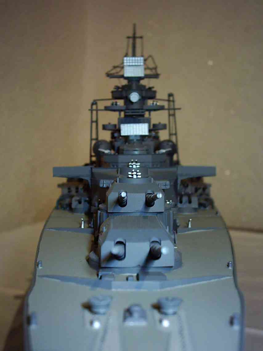| Die Beobachtungstürme drehten sich beim Schießen der Geschütztürme mit, um Korrekturen der Schußentfernung und Richtung zu ermitteln. Die Tirpitz wird auch in den Fachkreisen als Schwesterschiff der Bismarck bezeichnet. | Dabei kann der Profi die kleinen Detailunterschiede genau erkennen. Der Bausatz von Tamiya ist sehr passgenau und deshalb auch zu empfehlen. Bei Studium der Bauanleitung ist so ein Schiff innerhalb von einem Monat fertig gestellt. | |